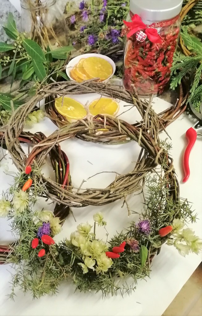 Siamo andati sul greto del Tagliamento e nel bosco e abbiamo preso polloni di salice di fiume, nocciolo e sanguinella per intrecciare le ghirlande. Per decorarle abbiamo preso rametti di ginepro, alloro, cipresso. Metteremo a disposizione anche luppolo e fette di arancia essiccati e i nostri peperoncini perché portino prosperità a tutte e tutti.