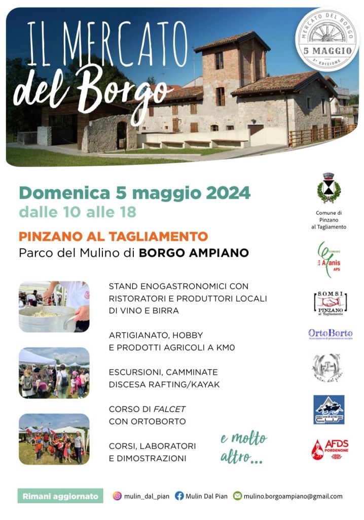 DOMENICA 5 MAGGIO 2024 DALLE 10 ALLE 16 ALLA FESTA DEL MERCATO DEL BORGO, PRESSO IL MULINO DI BORGO AMPIANO, PINZANO AL TAGLIAMENTO (PN)