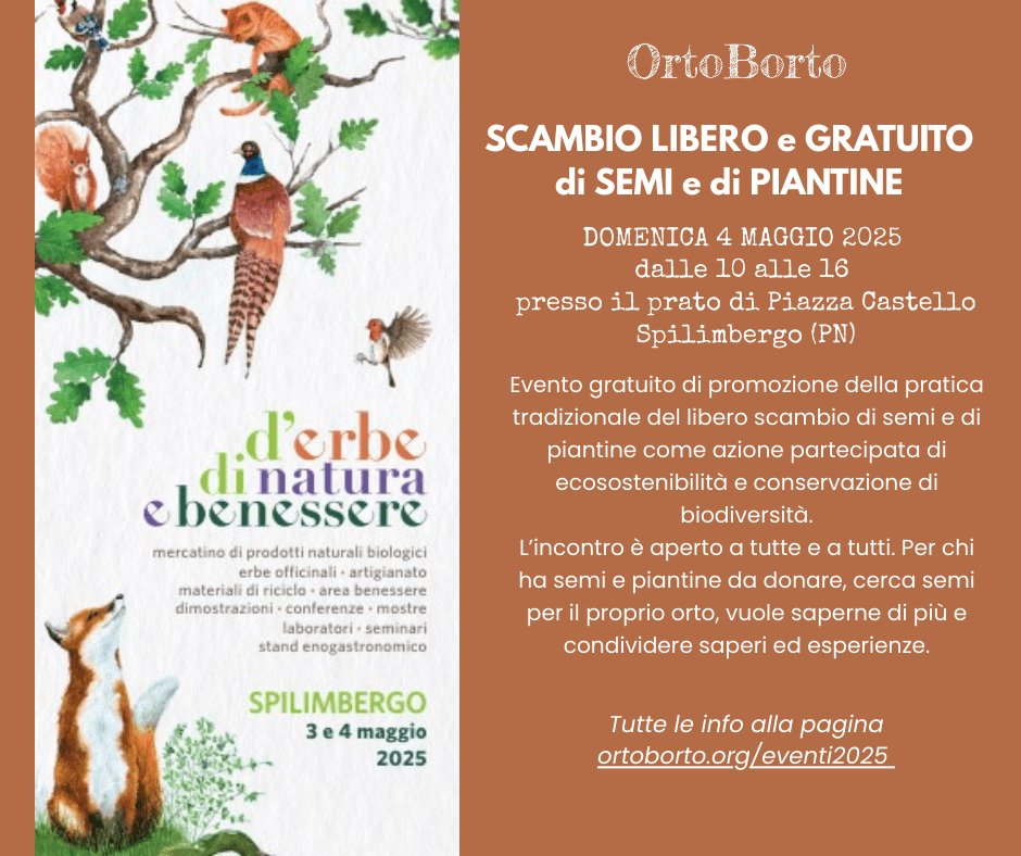 DOMENICA 4 MAGGIO 2025 dalle 10 alle 16 presso il prato di Piazza Castello, Spilimbergo (PN), saremo ospiti della ricchissima festa D’erbe, di natura e benessere dove organizzeremo un evento di scambio di semi e di piantine autoprodotti.