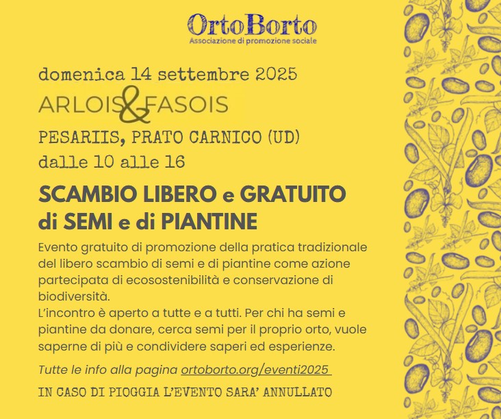 Domenica 14 settembre 2025, dalle 10 alle 16, saremo ospiti della festa Arlois e Fasois a Pesariis, Prato Carnico (UD), dove organizzeremo un evento di scambio di semi e di piantine autoprodotti.